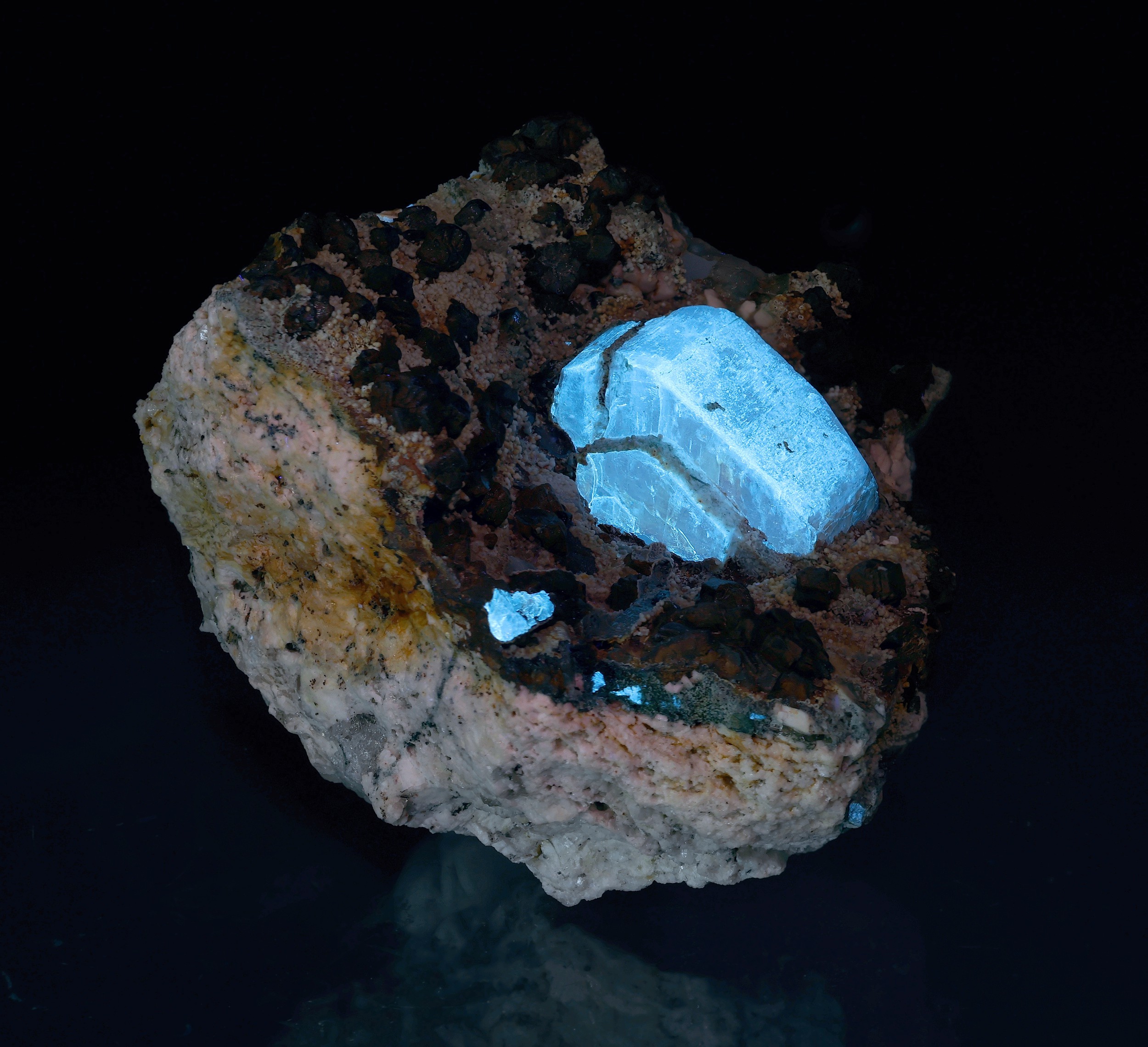 The second photograph shows zektzerite fluorescence under shortwave ultraviolet light.