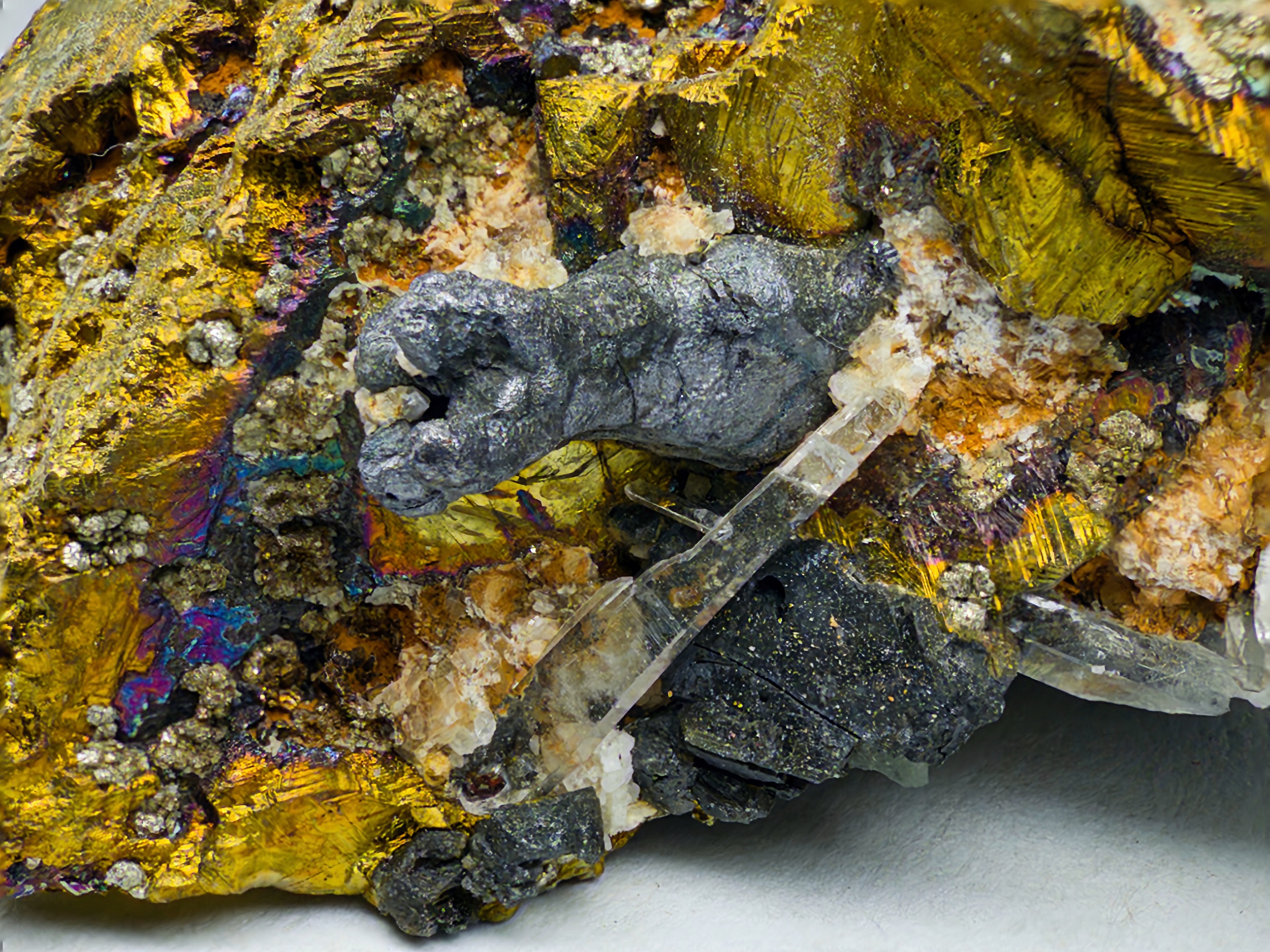 LILLIANITE? (a rare Lead-Bismuth Sulfosalt), SPHALERITE, SIDERITE, PYRITE and CALCITE on QUARTZ and CHALCOPYRITE Pedro Claim, Middle Fork of the Snoqualmie River, Snoqualmie Mining District, King County, Washington, USA Possible lillianite (gray mass shown in center of lower photograph). The sphalerite appears to be an epitaxial growth on the chalcopyrite. Specimen is 7.3 x 5.3 x 2.4 cm Collected by John Lindell. Eric He Collection. Photo Copyright © 2025 Eric He