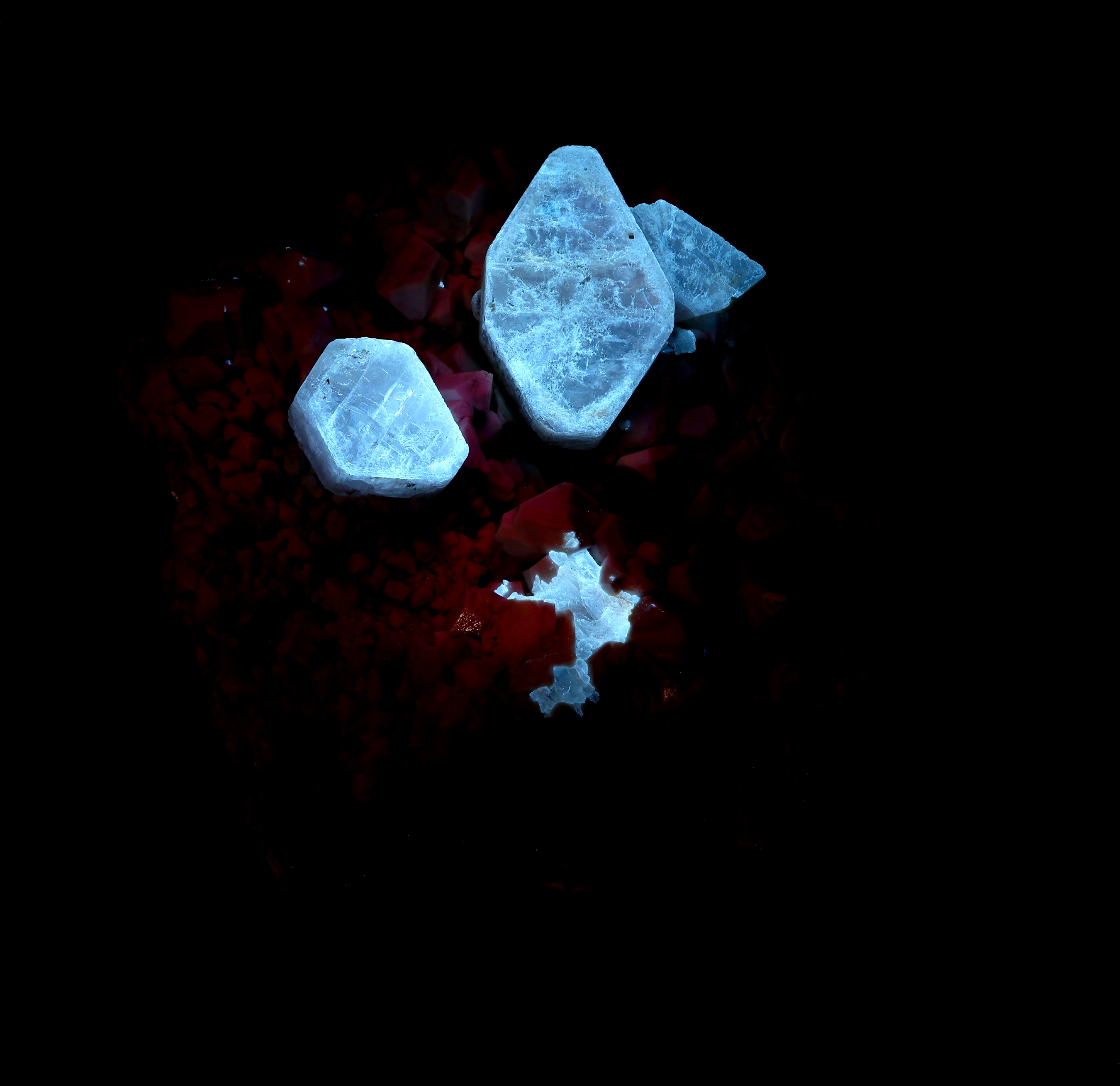 ZEKTZERITE on MICROCLINE matrix with minor ARFVEDSONITE Golden Horn Batholith, Washington Pass, Okanogan County, Washington, USA Specimen is ~5.5 cm (longest dimension) Eli Hess Collection The second photograph shows zektzerite fluorescence under shortwave ultraviolet light. Photo Copyright © 2025 Jeffrey M. Schwartz |