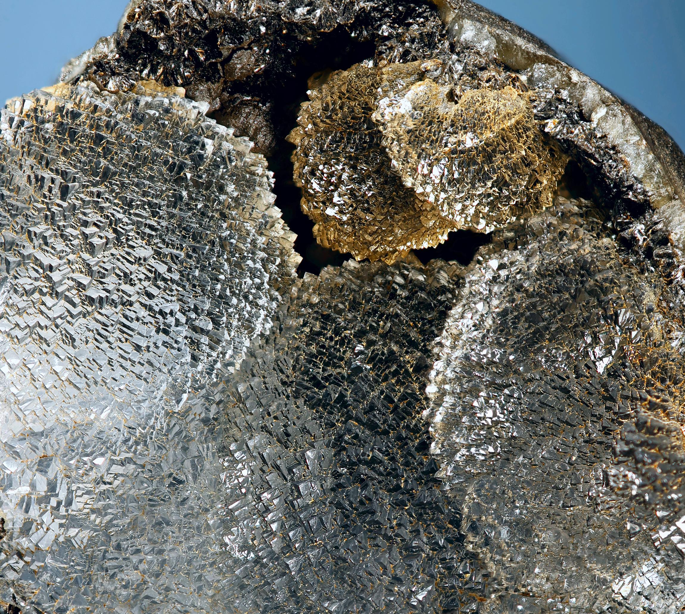 Fe endmember chlorite - (Fe,Mg)3Fe3(Si,Al)4O10(OH)8 - Some amygdules are lined with fine-grained dark green to black platy masses. | |||||