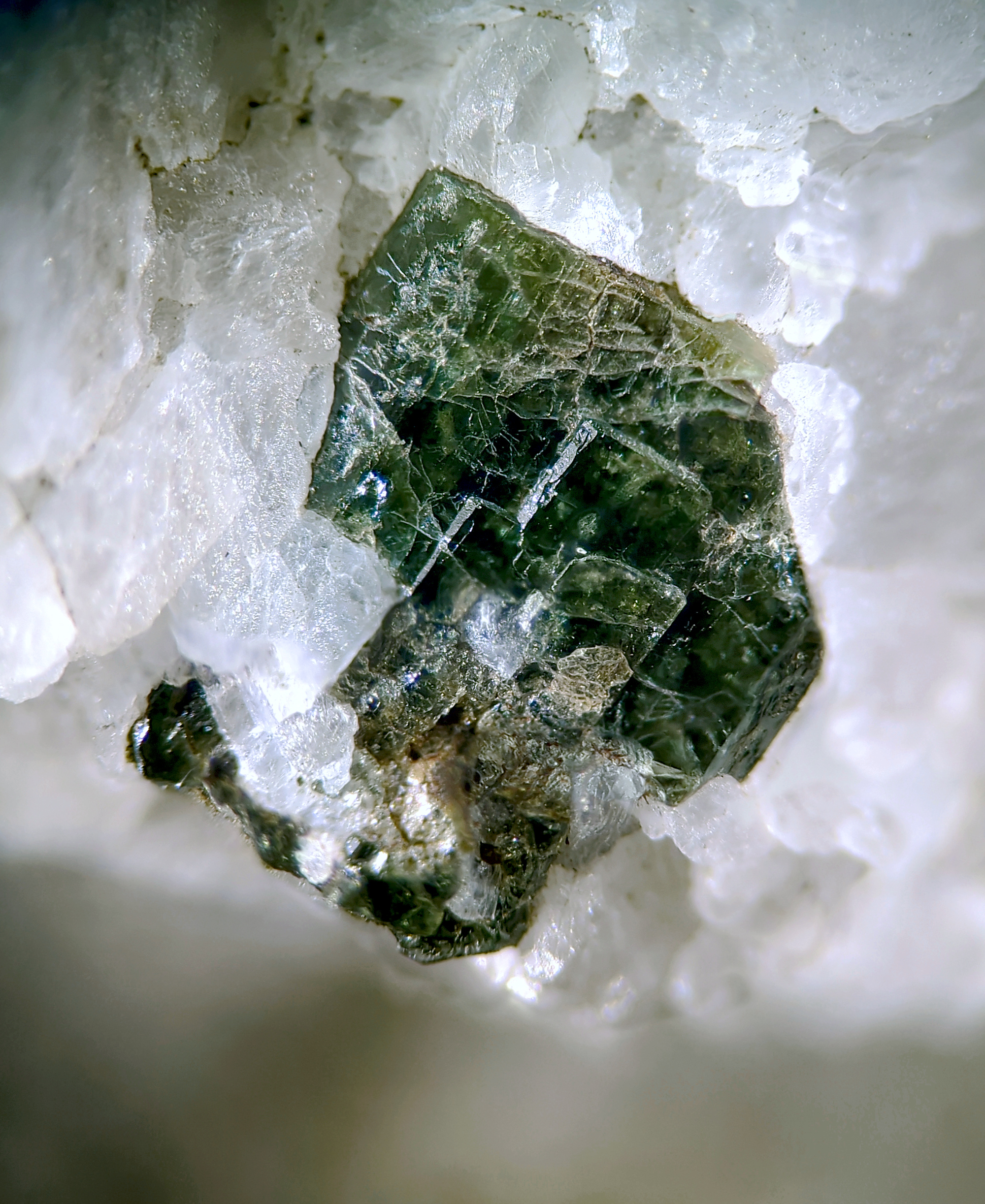 | CaMgSi2O6 - Small green translucent crystals up to 0.5 cm occur in massive calcite. | |