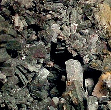 | Fe2O3 - Occurs as massive platey aggregates of lustrous silver crystals and as terminated rosettes, typically enclosed in calcite. Also occurs as mm-scale red and silver inclusions in quartz crystals ("raspberry" scepters). | |
