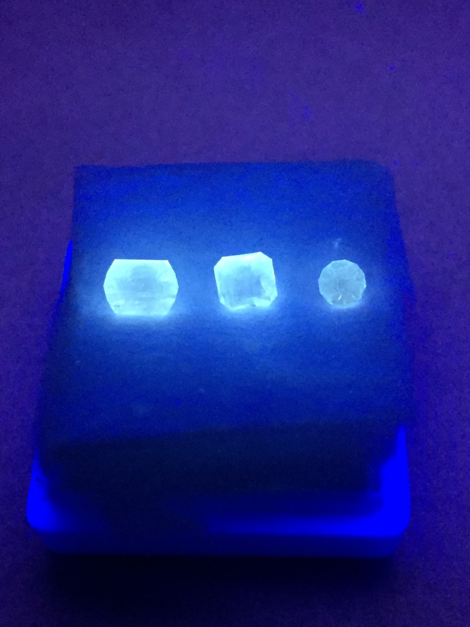 Faceted ZEKTZERITE crystals Golden Horn Batholith, Washington Pass, Okanogan County, Washington, USA Professionally faceted by Jamie Henman. Visit Jamie's gems-down-under Instagram page to view more of Jamie's impeccable work. A 0.45 ct zektzerite faceted in a mixed cut called "Lucciola" (left), 6mm x 4mm. Like most zektzerite it is somewhat fractured. However it is quite scintillating, very gemmy and very pink. The polish is perfect and the meet points are excellent. Another 0.45 zektzerite faceted in a slightly different square barion design called "Trattola" (center). This gem measures just under 5mm x 5mm. Although somewhat fractured it is very gemmy and very pink. On one side of the girdle there is a slight pitting from the surface of the original rough, barely visible to the naked eye. The polish is perfect and the meet points are excellent. Finally a .20 ct 4mm x 4mm zektzerite faceted in a round design called "Tensor"(right). Although it has some minor internal craziness, this stone is not fractured and is extremely gemmy and pink. Photo Copyright © 2020 Jamie Henman |