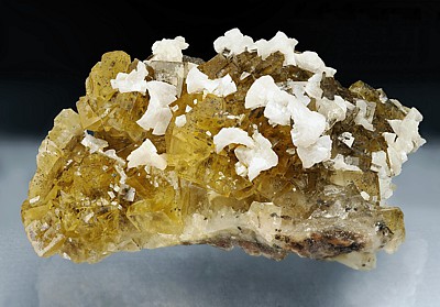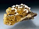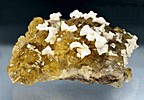 ![]() | Lustrous, saturated honey yellow fluorite crystals with sharp white curved crystals of dolomite perched on the fluorite. Pyrite inclusions are visible in the fluorite. An interesting globular pyrite can be seen in cross section on the back of the cluster as shown in one of the photographs. This is a very elegant specimen from this famous Spanish locality. The specimen in in superb condition, with only normal contact along the edges. A specimen label is included.