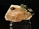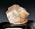 ![]() | ![]() This is a select apatite on cleanly cleaved calcite from the Yates mine, Quebec, Canada. I hand selected this specimen from a Canadian dealer in Tucson this year The color contrast between the green apatite and the translucent orange calcite is superb. The top of the apatite is nicely terminated with and is partially gemmy. The specimen is mounted on a polished acrylic base with removable mineral tack. A specimen label is included.