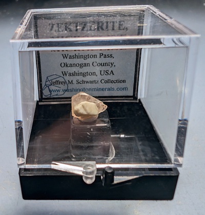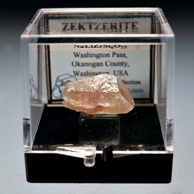 ![]() | ![]() For sale is a light-pink, gemmy to translucent terminated zektzerite crystal from a miarolytic cavity within the alkali granite of the Golden Horn Batholith located at Washington Pass, Washington. The crystal is in very good condition for the locality. Zektzerite fluoresces light blue under short-wave ultraviolet light. The specimen is professionally mounted in a pedestal-style perky box with a specimen label. Visit my Washington Pass page at Washington Minerals for more information about this mineral occurence.