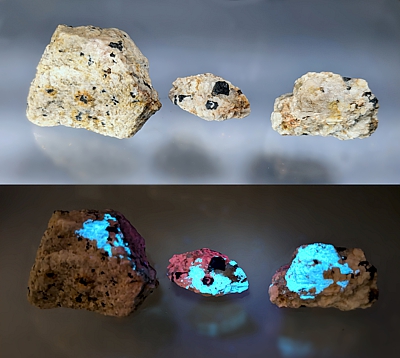 ![]() | ![]() Not often will you see gemmy pink crystals of zektzerite on matrix. Here is an outstanding specimen exhibiting two perched saturated pink crystals of zektzerite on a matrix of microcline from the alkali granite of the Golden horn Batholith at Washington Pass, Washington. The specimen is in great condition for the locality. The front crystal is complete with some minor nicks. The back crystal has been partially cleaved, showing the incredible gem quality of these crystals. As shown in the final photograph, zektzerite fluoresces bright pastel blue under shortwave ultraviolet light. The brighter fluorescence at the rim of the crystals is likely due to compositional zoning and final crystallization of sogdianite. A specimen label is included. Visit my Washington Pass page at Washington Minerals for more information about this mineral occurence.