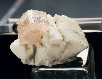 ![]() | For sale is a beautiful light-pink translucent double-terminated zektzerite crystal on a matrix of white microcline crystals from a miarolitic cavity in the alkaline granite of the Golden Horn Batholith located at Washington Pass, Washington. Zektzerite fluoresces light blue under short-wave ultraviolet light. The specimen is in great condition for the locality with some minor nicking on the left edge. The specimen is professionally mounted in a pedestal-style perky box with a specimen label. This specimen Visit my Washington Pass page at Washington Minerals for more information about this mineral occurence.