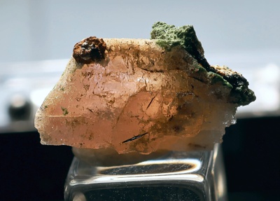 ![]() | ![]() This is an outstanding gemmy light pink complex zektzerite crystal with stepped pseudohexagonal termination faces from the alkali granite of the Golden Horn Batholith near Washington Pass, Washington. The specimen is in very good condition as shown in the photographs. The back of the specimen is partially a contact where it was attached to the matrix. The zektzerite is associated with a flower of microcline and is partially coated with an unidentified spherical brown-colored mineral (possible sphaerosiderite or goethite). Zektzerite fluoresces light blue under short-wave ultraviolet light as shown in the last photograph. The specimen is professionally mounted in a pedestal-style perky box with a specimen label. The acrylic cube that the specimen is mounted on is about 1 cm wide for scale. Visit my Washington Pass page at Washington Minerals for more information about this mineral occurence.