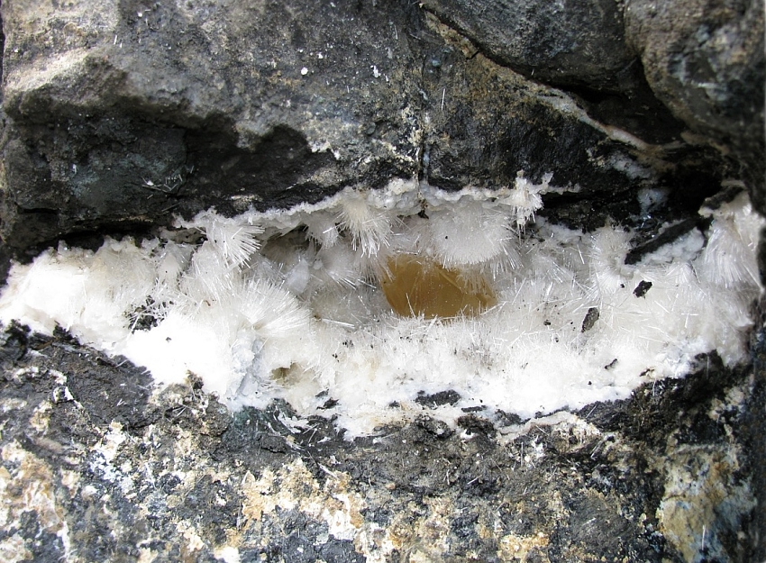 - Occurs as radiating crystal groups lining large pockets up to several feet long. Some natrolite pockets also contain a late stage clay mineral that coats the needles. Some pockets are completely filled with laminated clay.