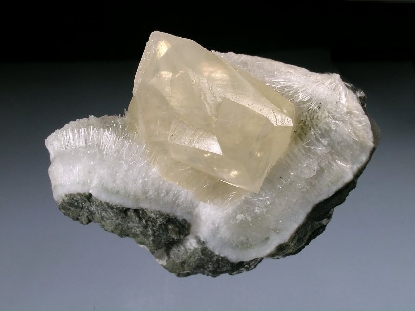 - Occurs as beautiful tea-colored rhombohedral crystals. Twins are common. Crystals are found in vugs associated with natrolite and/or analcime. Crystals are phosphorescent under short- and long-wave ultraviolet light. | (Mg,Fe)3(Si,Al)4(Mg,Fe)3O10(OH)8